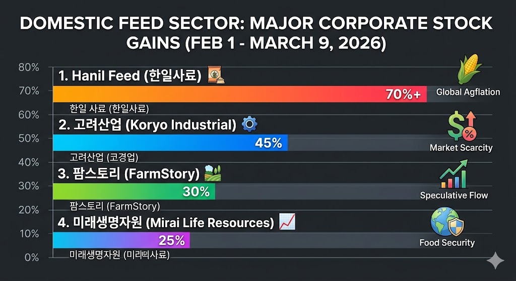 - 비교 분석: 2월 초부터 3월 9일까지의 상승률을 비교해보면, 한일사료(70%+)가 압도적인 대장주 역할을 하고 있습니다. 고려산업(45%), 팜스토리(30%), 미래생명자원(25%) 등 경쟁사들도 모두 큰 폭의 동반 상승을 기록했습니다. 이는 특정 기업만의 이슈가 아니라 '사료/곡물 섹터 전체'에 대한 시장의 강력한 매수세가 유입되고 있음을 분명히 보여줍니다.